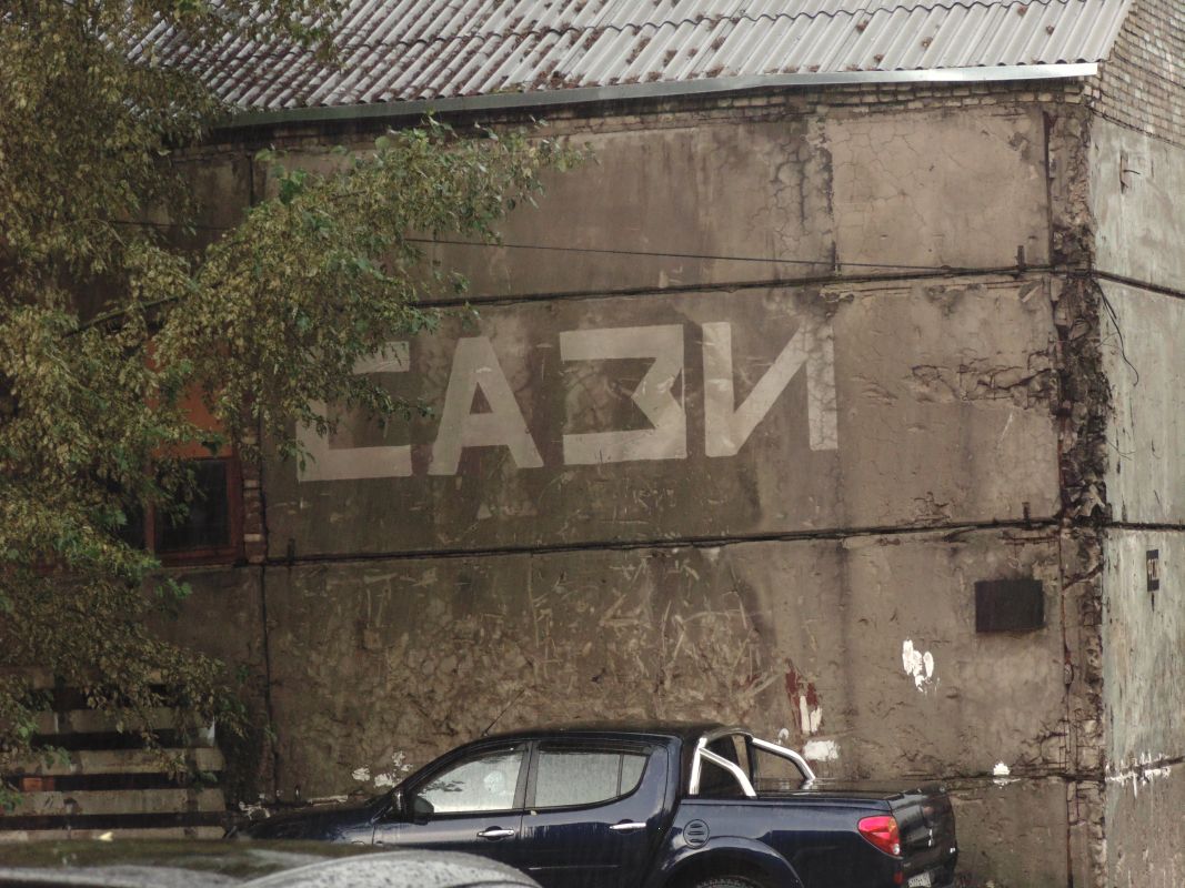 Здание представляет собой сооружение из бетонных панелей постройки примерно двадцатилетней давности. На внешней стене здания мы нанесли гидрофобизатором Типром К надпись, которая проявляется при смачивании стены водой ⇨